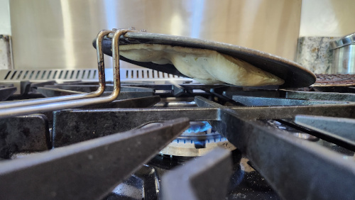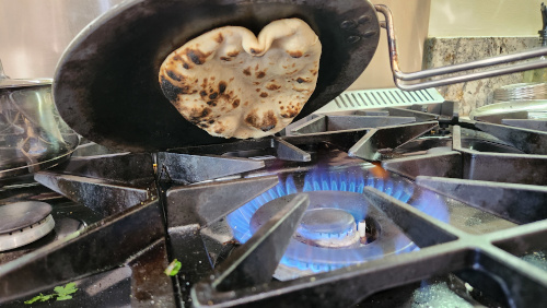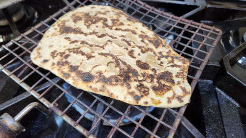 - Once you see a few bubbles forming, lift the griddle and turn it upside down on the flame so that the roti is directly on the flame. If the roti falls down, you can pick it up with the tongs and cook it over the flame on both the sides. Generally, the roti stays stuck on the griddle while you hold the griddle upside down. In any case, cook it evenly all around on direct flame. Keep the flame on medium. Too high a flame will burn the roti and too low a flame will make the roti hard.