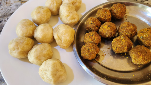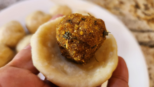 - Mix boiled dal, roasted besan and all the spices with 25 gm of oil. Add a little bit of water to make a soft dough. Divide into 10 parts and make balls.